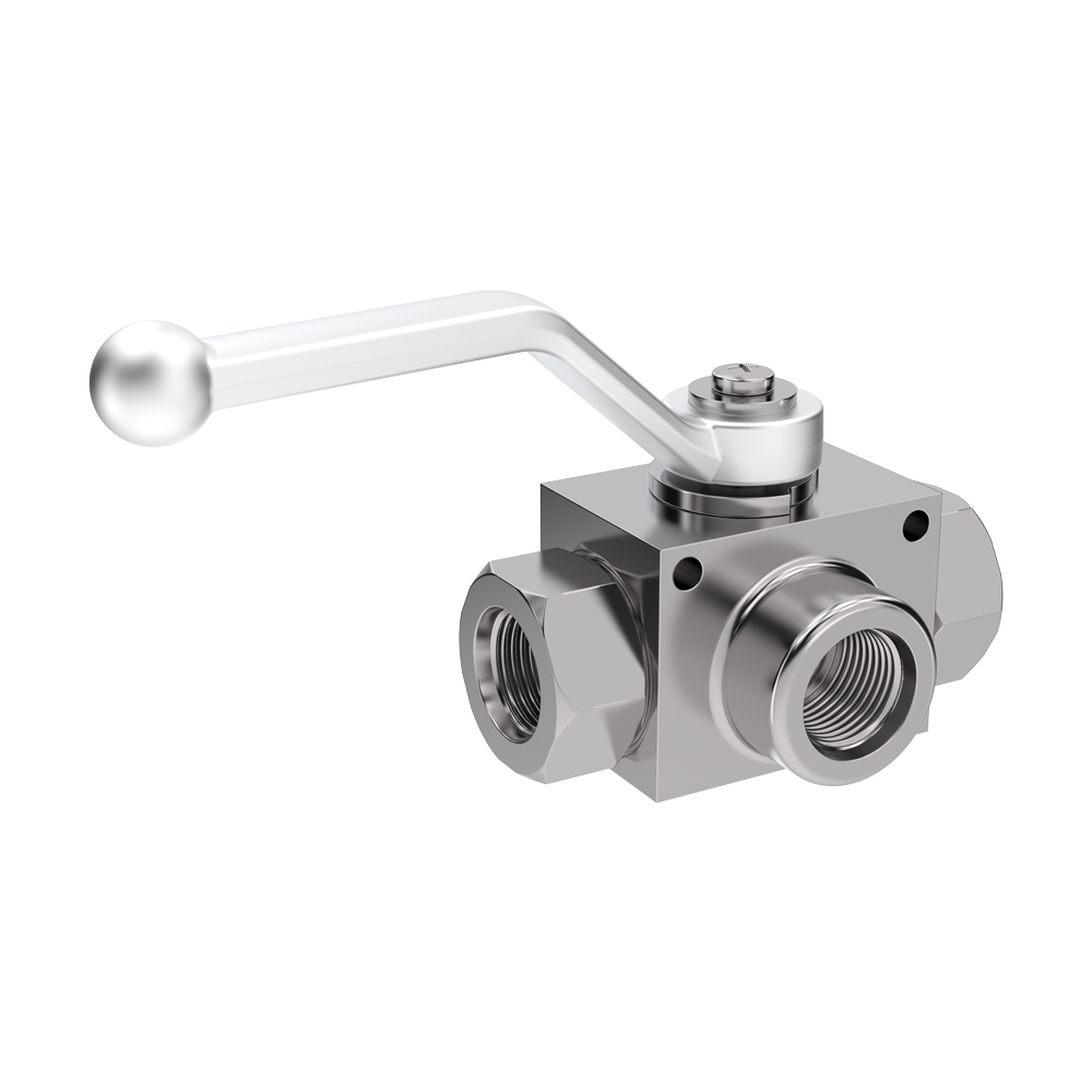 Zawór hydrauliczny kulowy, trójdrożny z wewnętrznymi gwintami BSP i dwoma otworami do montażu panelowego.